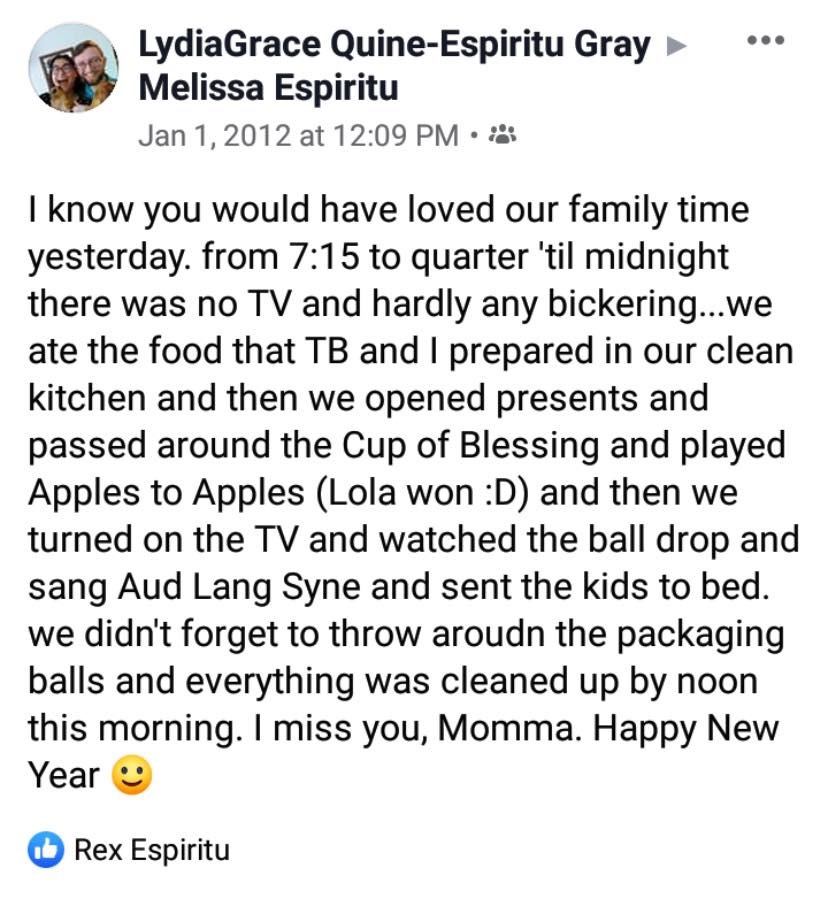 It’s hard not to wish you were here, but Happy New Year all the same, Momma! I bet the party up there is like no other, even though I’m not sure if time and the New Year is that relevant in Heaven haha. Thank you for instilling in all your children the importance of togetherness. We’re all this close because of that unbreakable bond you told us we had all those years ago. I love you, Momma. Happy Holidays in Heaven! 😊😊